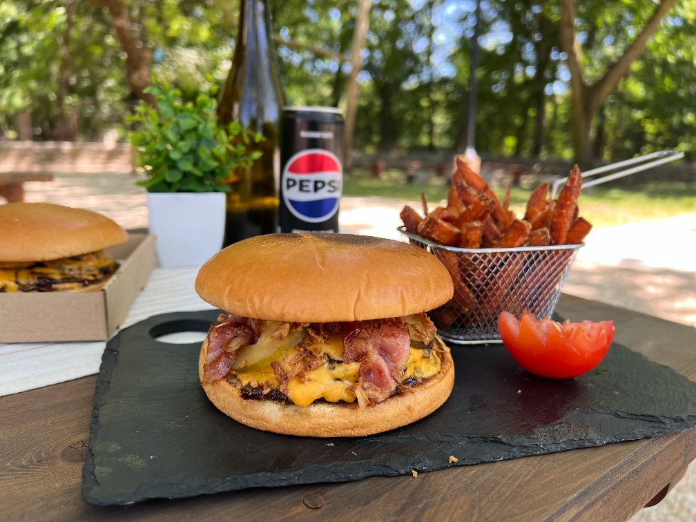 Két szaftos marhahúspogácsa friss zöldségekkel, olvadt Cheddar sajttal és házi szósszal a tökéletes burgerélményért.